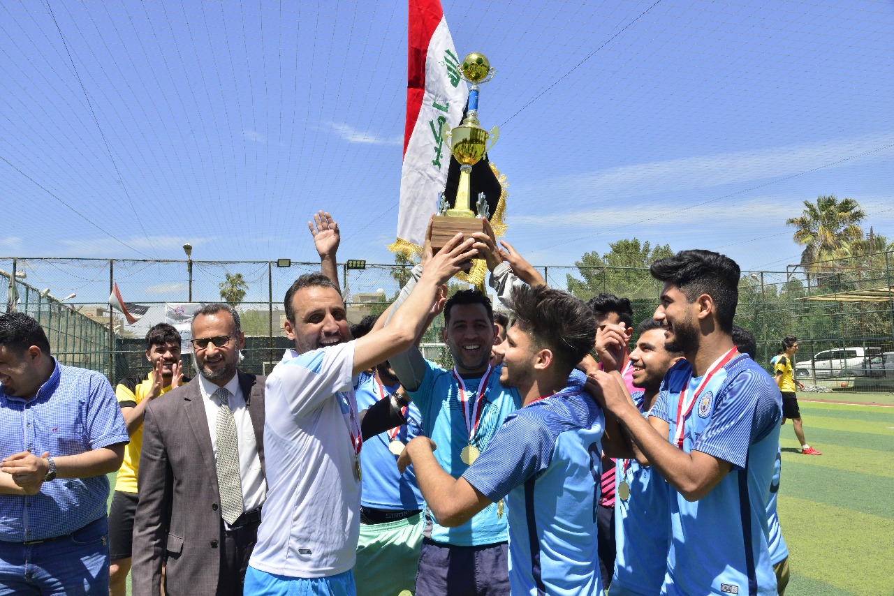 The team of the Faculty of Business Informatics culminated with the University Cup after the end of the match. The head of the student activities department and the chairman of the committee supervising the championship at the university Dr. Imad K. Al Kaabi honored the winning team of the championship and the distribution of medals to the players of the two teams.