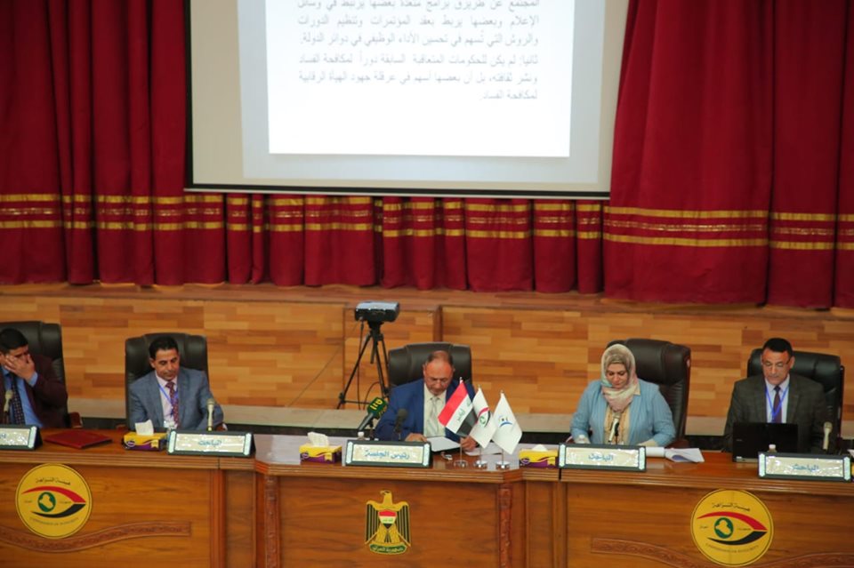 The session that was chaired by Dr. Al Bakry consisted of 4 researches as follows: (Legislative Failure in Fighting Illegal Earning in Iraq) presented by (Asst.Prof. Dr. Khdayer Al Maamouri), (The Effect of Media in Supporting Censorship Offices to Fight and Weaken Corruption) presented by (Dr. Ghalib Kadhim Al Daami). The two other researches were titled in (Towards the Understandings of Zero Corruption in the Iraqi Environment), and (The Role of Judgmental Authorities in Applying Procedural provisions for Refunding Public Money), respectively.