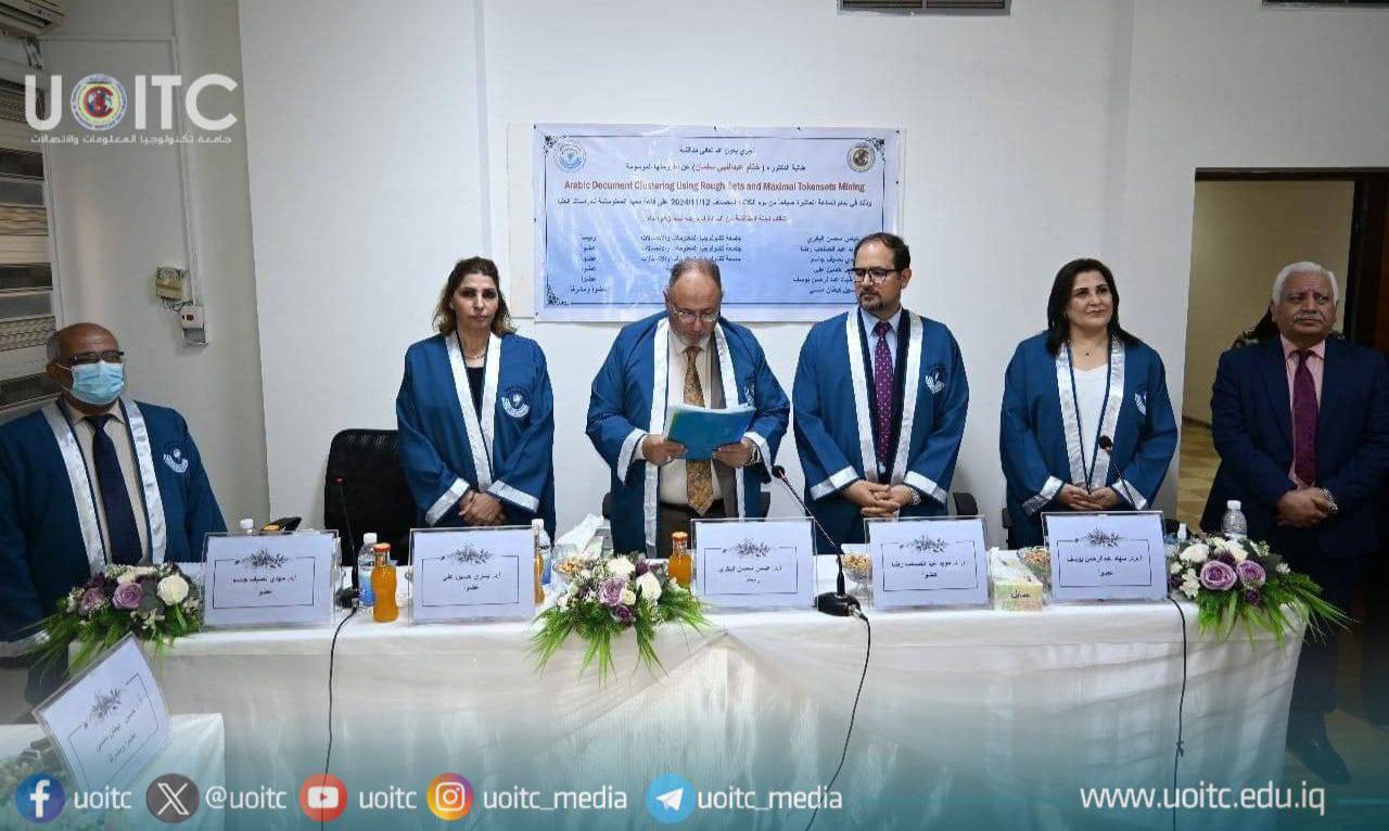 The doctoral thesis of the student Khitam Abdulnabi Salman was discussed at the Institute of Informatics for Post-Graduate Studies at the University of Information Technology and Communications. The thesis, entitled “Collecting Arabic Documents Using Approximate Groups and Mining Maximum Vocabulary Groups”, came in the field of computer science, as technological solutions were proposed based on new algorithms. The thesis developed solutions to address the limitations facing the processes of collecting Arabic documents in the fields of information retrieval, data mining, Arabic search engines, sentiment analysis, topic modeling, document summarization, and user review analysis. At the end of the discussion, the student Khitam Abdulnabi obtained a doctorate with a very good grade.