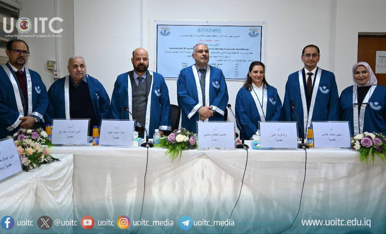 The doctoral thesis on automatic control of propofol doses during general anesthesia was discussed at the Institute of Informatics for Postgraduate Studies at the University of Information Technology and Communications. The study presented by student Ammar Tu’ma Namal focusing on improving the prediction and control of depth of anesthesia (DOA) during general anesthesia through innovative modeling and control methods. The results of this study provide the ability to revolutionize anesthesia management, which enhances patient care during surgical operations.