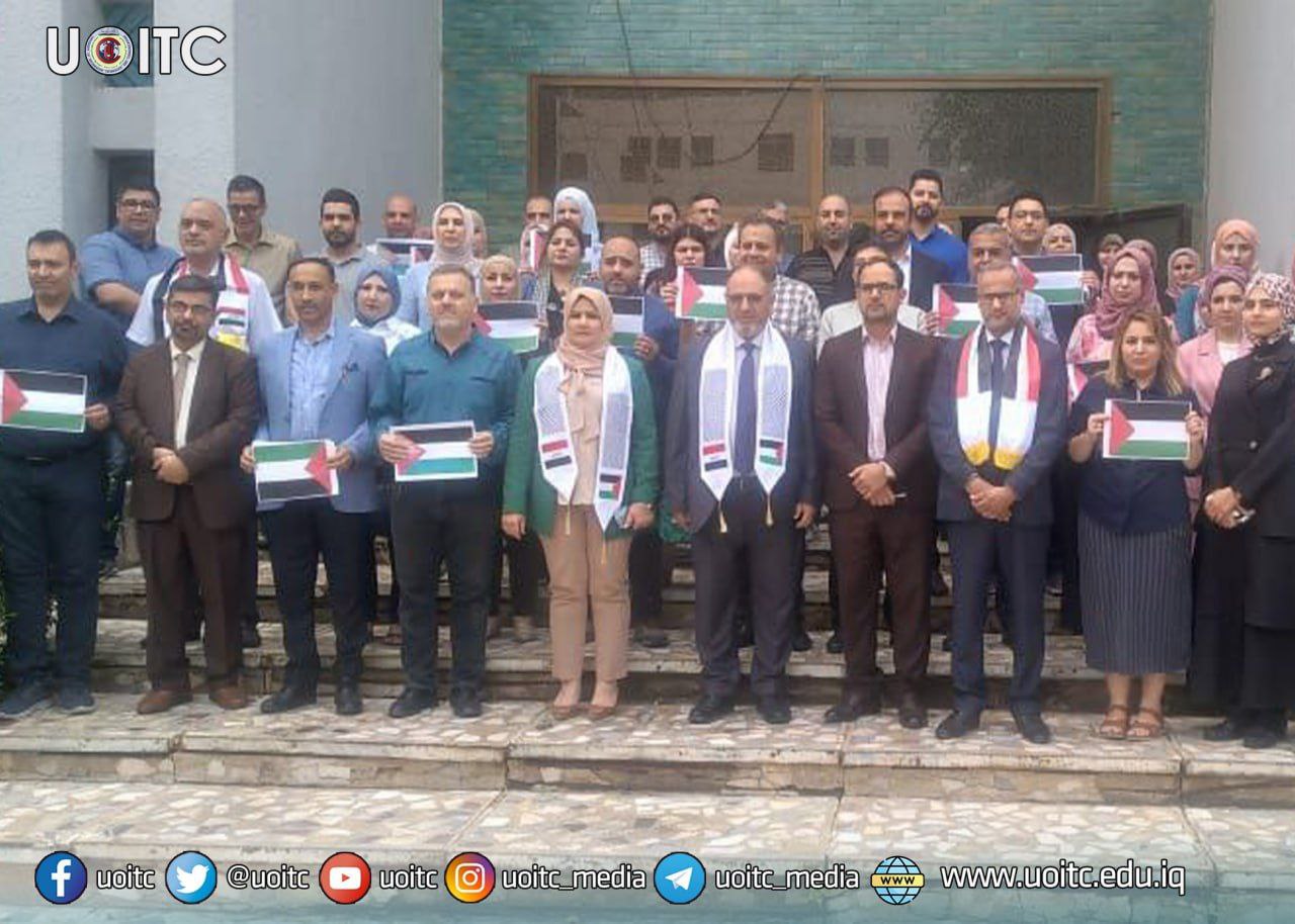Following the directive of the Minister of Higher Education and Scientific Research, His Excellency Dr. Naeem Al-Aboudi, for universities to organize solidarity stands with the Palestinian people, members and students of UoITC organized a solidarity stand to support universities and international academic institutions that supported the Palestinian cause and opposed the Zionist aggression.