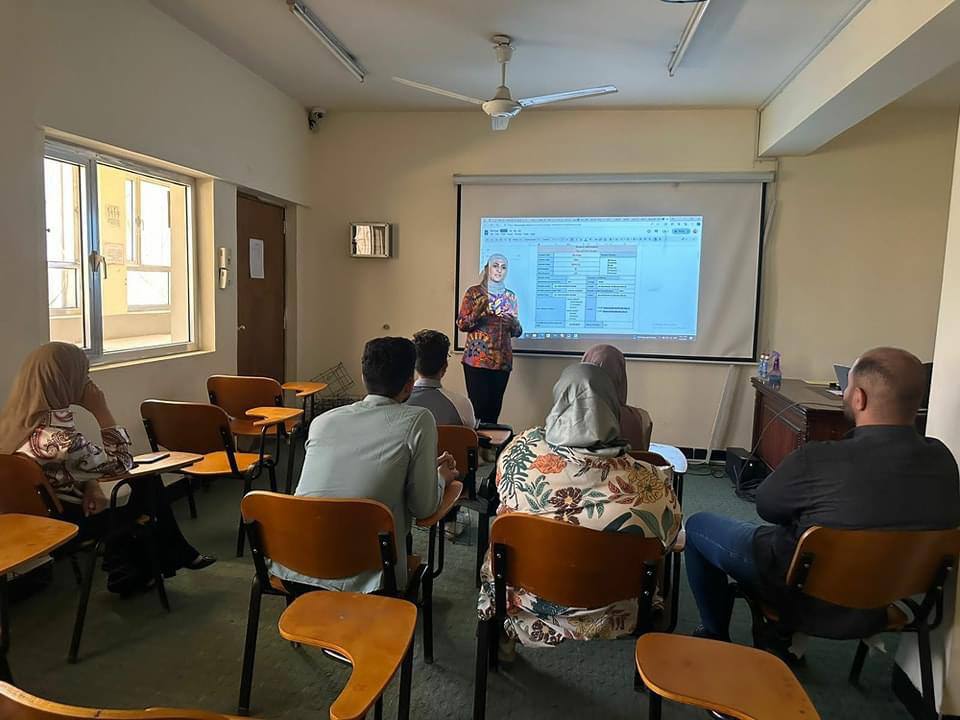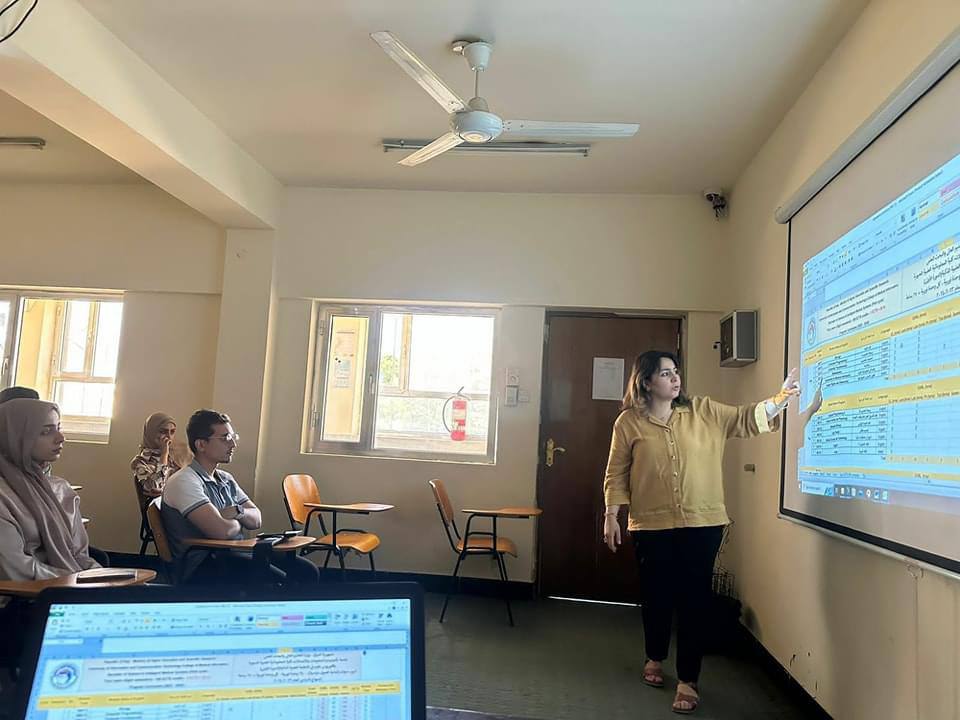 The workshop, presented by the head of the department Dr. Dunia Hamed and the department coordinator Ms. Atiyaf Sami, aims to explain the Bologna system and its basic concepts regarding study materials, units, scheduled and unscheduled hours.