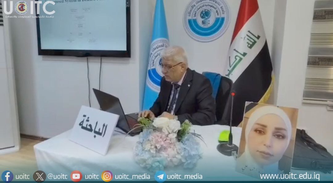 The late student’s thesis was discussed at the University of Information Technology and Communications, and her supervisor, Prof. Dr. Ziad Tareq Mustafa, represented her, under the patronage and attendance of the President of the University, Prof. Dr. Abbas Mohsen Al-Bakri, his scientific assistant, Asst. Prof. Dr. Haider Hassan Mshali, the Dean of the College of Computer Science at the University of Diyala, and a number of faculty staff, in addition to the head and members of the discussion committee, namely, the head of the committee, Prof. Dr. Ali Makki Al-Sagheer, and the membership of Prof. Dr. Mahdi Nsaief Jassem, Prof. Dr. Mu’ayyad Abdul-Ridha Saheb, Prof. Dr. Mazen Sameer Al-Hakeem, and Asst. Prof. Dr. Raja’a Kadhum Hassoun.