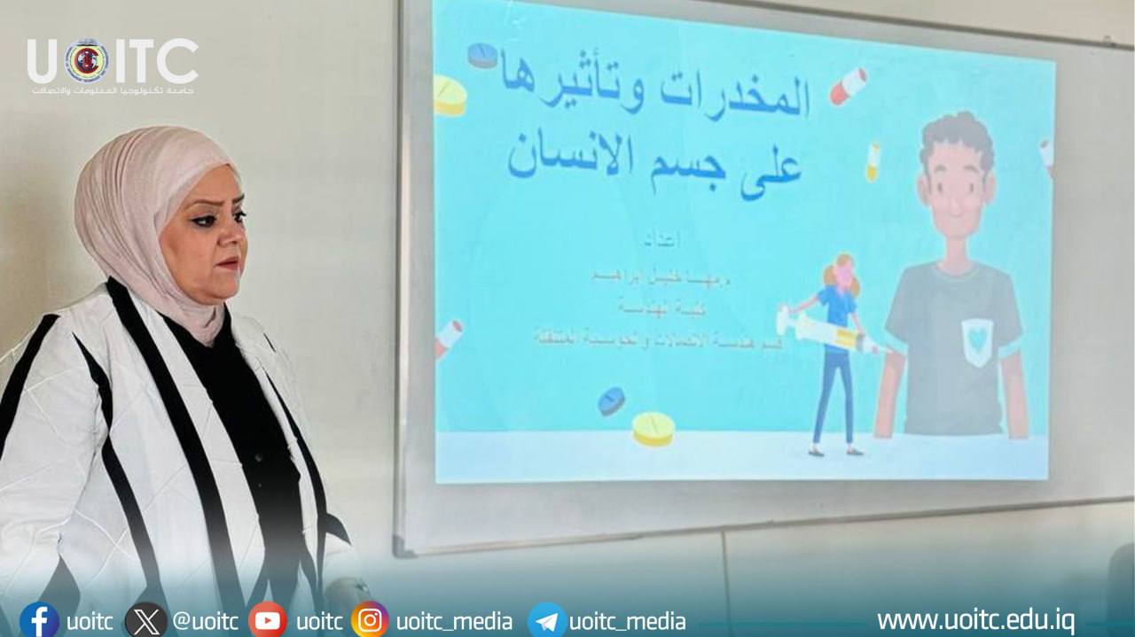 As part of the Iraqi Anti-Drug Week activities, the Psychological Counseling and Educational Guidance Unit at the College of Engineering at UoITC organized an awareness seminar for first-year students titled “Combating Drugs: Harms, Challenges, and Treatment Methods.”