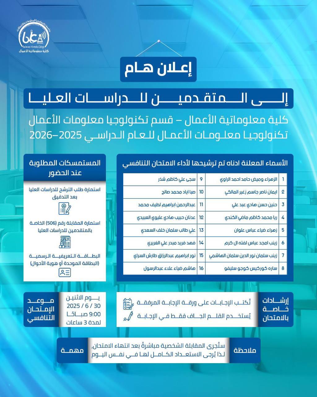 UoITC is pleased to announce the names of applicants eligible to take the entrance exam for postgraduate studies for the academic year 2025–2026 in the following units: