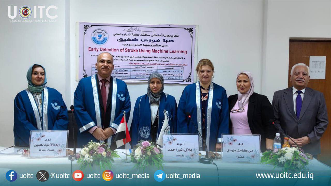 The project of postgraduate diploma student Saba Fawzy Shafiq, on machine learning for early prediction of stroke, was discussed at the Informatics Institute for Graduate Studies.
