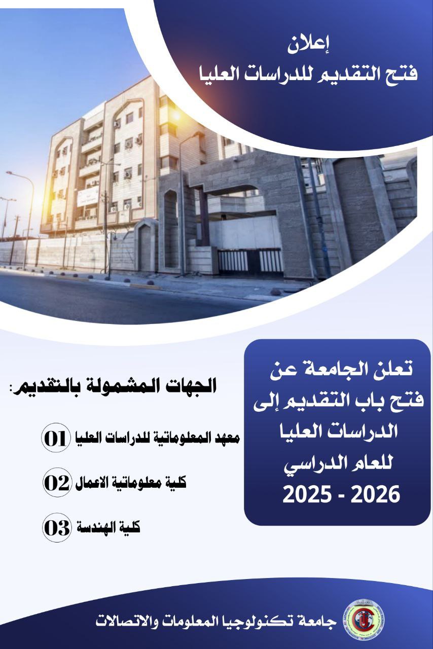 The University of Information Technology and Communications (UoITC) announces the opening of applications for postgraduate programs for the academic year (2025/2026) in the Institute of Informatics for Postgraduate Studies, the College of Engineering, and the College of Business Informatics.
