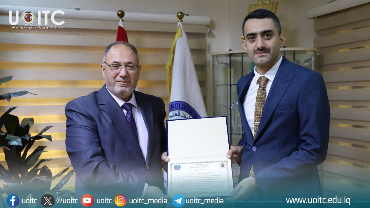 In the end of the workshop, the President of UoITC, Prof. Dr. Abbas Mohsen Al-Bakri presented a certificate of appreciation to the lecturer in recognition of his efforts in delivering the workshop, which witnessed the participation of a number of employees from various ministries and state institutions.