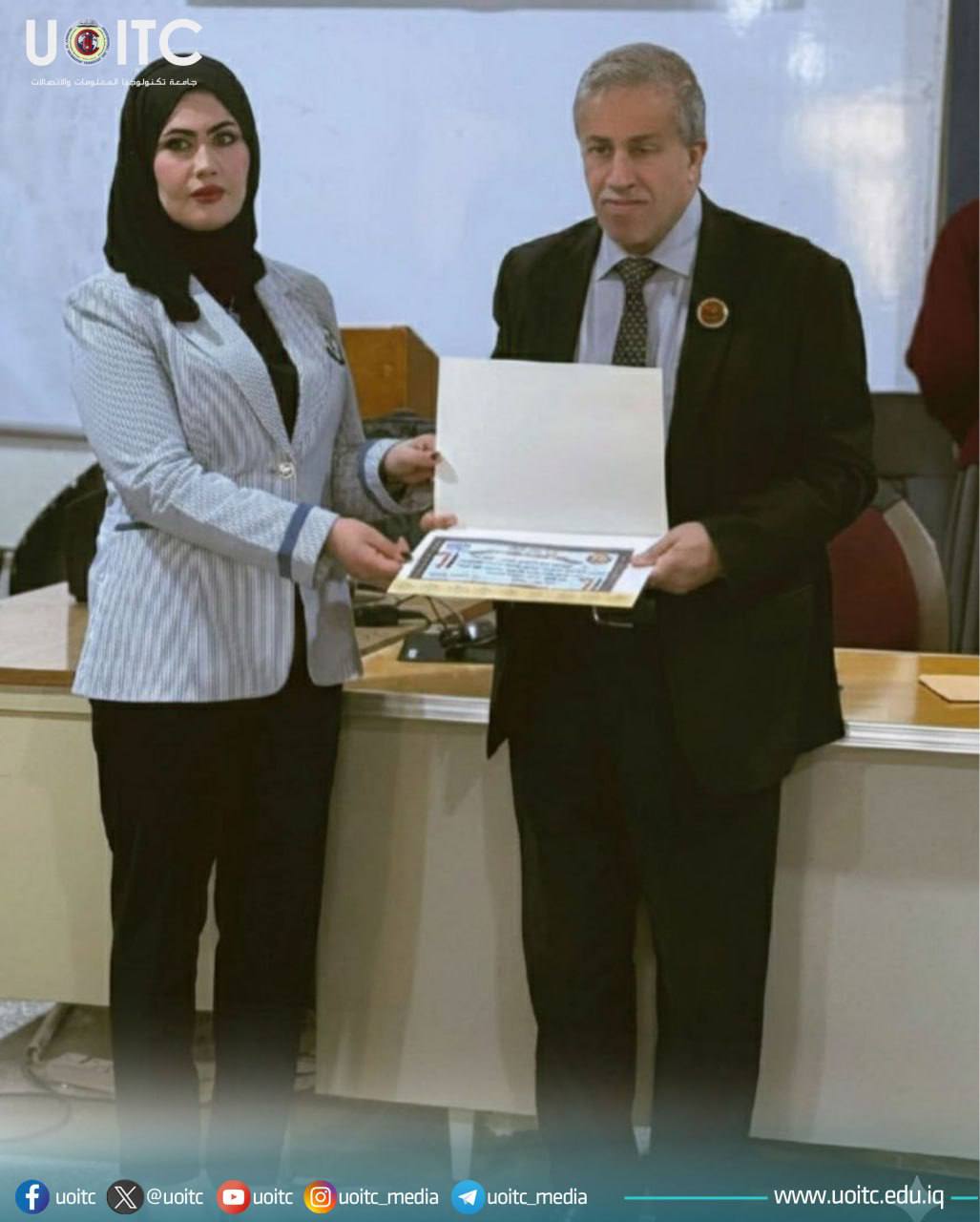 Fatima Asa’ad Hikmat, a master’s student in the Department of Mobile Communications and Computing Engineering at the College of Engineering at the University of Information Technology and Communications, delivered a scientific lecture as part of the workshop entitled “The Importance of Artificial Intelligence and its Impact on Society”, which was held by the Artificial Intelligence Club at the Technical Institute in Al-Shatra.