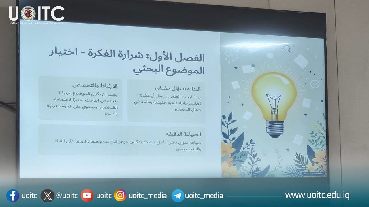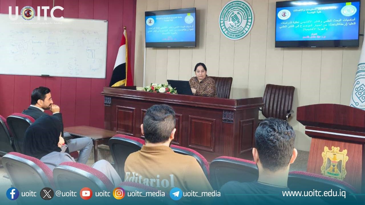 The College of Engineering at the University of Information Technology and Communications, as part of its program aimed at developing the scientific research skills of graduate students, held a workshop titled “Fundamentals of Scientific Research and Academic Publishing for Postgraduate Students,” presented by Assistant Lecturer Dr. Ola Adel Qasim.