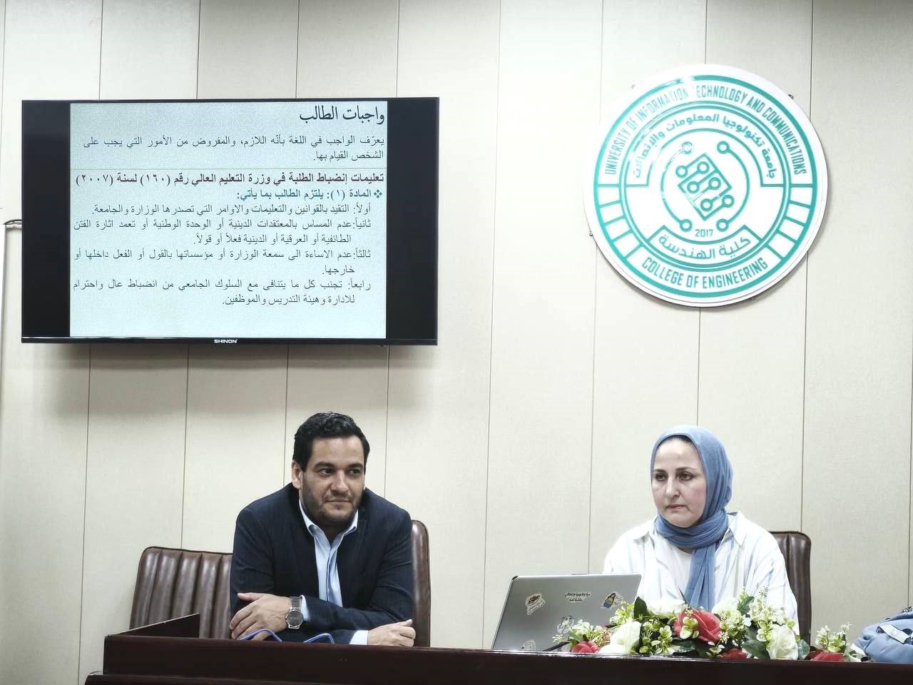 The College of Engineering at the University of Information Technology and Communications (UOITC) organized an awareness seminar for first-year students titled “Rights and Obligations of University Students.” The seminar was presented by Assistant Professor Dr. Ahmed Abbas and Lecturer Ghosoon Saeed from the Department of Media Technology and Communications Engineering.