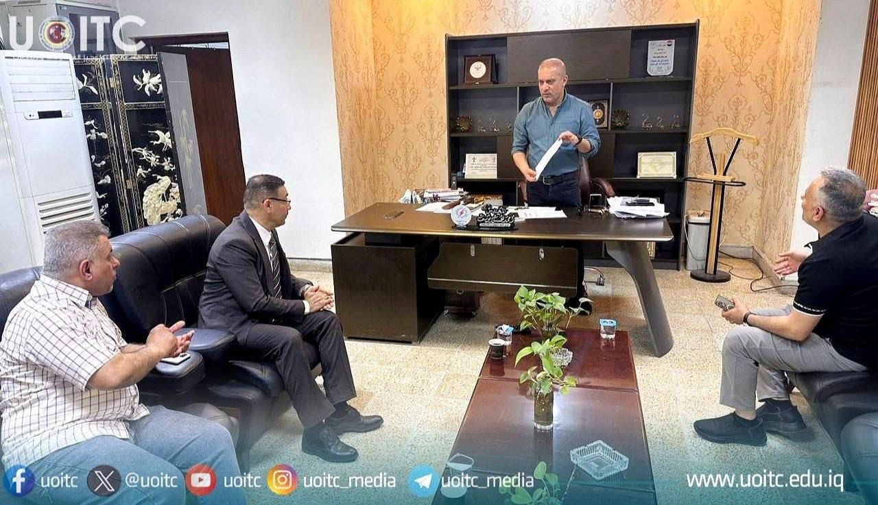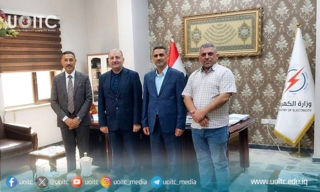 As part of strengthening the partnership between academic institutions and service providers, a delegation from the University of Information Technology and Communications (UoITC) paid an official visit to the headquarters of the General Company for Electricity Distribution in Baghdad, headed by the Assistant President of the University for Administrative Affairs, Professor Dr. Jaafar Adhab Angoud, and accompanied by Engineer Shukr Hamid Jumaa, Director of the Administrative Affairs Department.