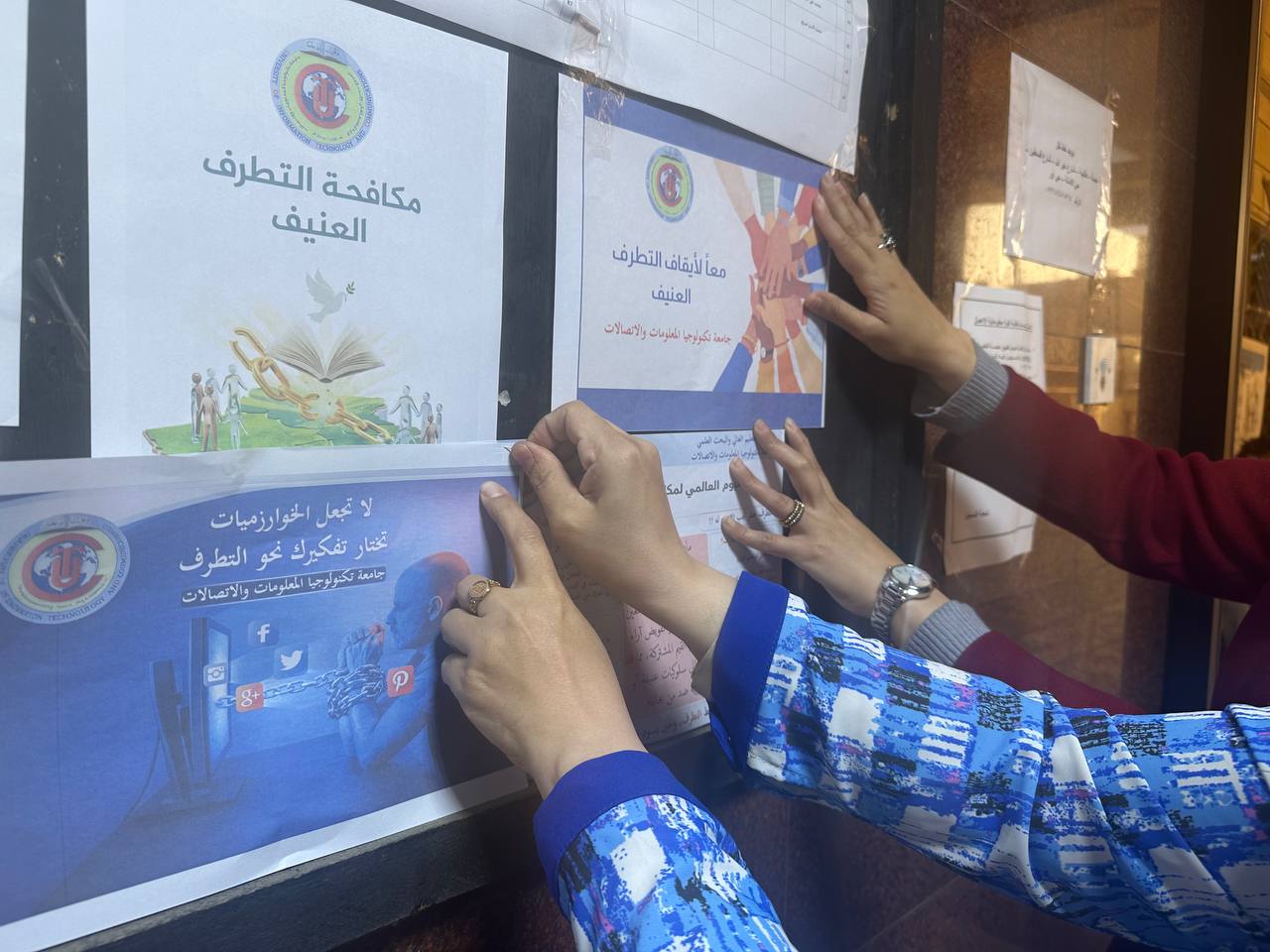 In accordance with the directives of the Ministry of Higher Education and Scientific Research to hold special events for the International Day for the Prevention of Violent Extremism, the University of Information Technology and Communications organized a wide-ranging educational campaign targeting students and staff of the university and its colleges, aimed at raising awareness about the dangers of extremism and promoting values of moderation and tolerance.