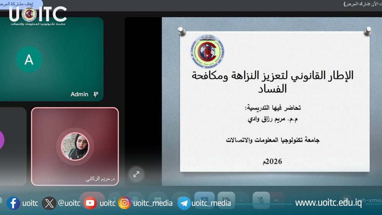The workshop, presented by Assist.lec. Mariam Razaq Wadi, aims to reinforce the legal concepts related to integrity and transparency, highlighting the importance of national and international legislation in reducing the phenomenon of corruption, thereby fostering an institutional environment based on adherence to legal and ethical values.
