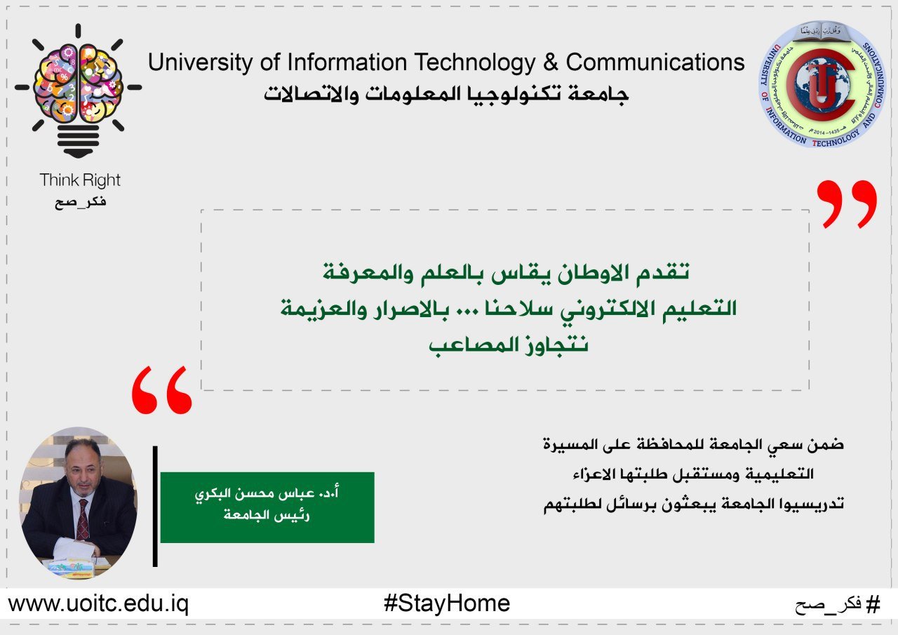 أطلقت جامعة تكنولوجيا المعلومات والاتصالات مبادرة تحفيزية لطلبة الجامعة لأجل الالتزام بالتعليم الالكتروني، عن طريق نشر رسائل وعبارات تشجيعية من قبل أساتذة ومنتسبي الجامعة.