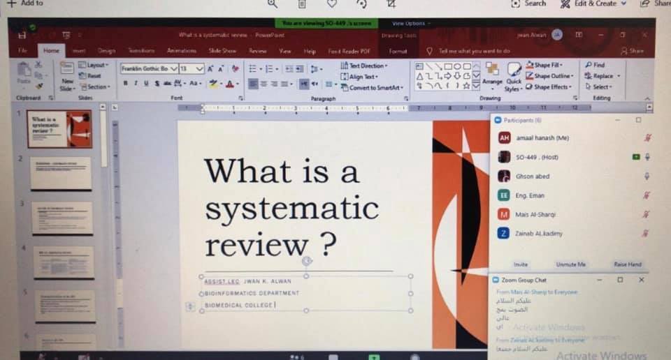 اقامت كلية المعلوماتية الطبية الحيوية ندوة الكترونية بعنوان ” What is a scientific review” نظمت كلية المعلوماتية الطبية الحيوية ندوة الكترونية عن scientific review وتطرقت الندوة الى التعريف والخطوات الاساسية التي يجب ان يتبعها الباحث في عمل هكذا نوع من البحوث حيث تعتبر من انواع البحوث المهمة التي تساعد في زيادة عدد الاستشارات للباحث مما يزيد من مقياس h-index الخاص به والذي بدوره يعزز من سمعته البحثية . وقدمت الندوة م.م جوان كنعان علوان التدريسية في قسم المعلوماتية الاحيائية عبر منصة zoom .