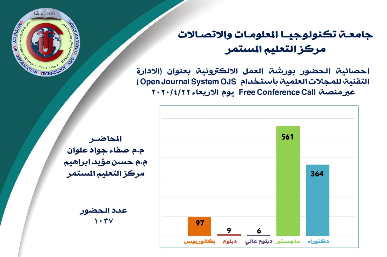 عقد مركز التعليم المستمر في جامعة تكنولوجيا المعلومات والاتصالات ورشة عمل إلكترونية حول استخدام نظام المجلات المفتوحة لإدارة المجلات العلمية. تهدف الورشة إلى تمكين الإدارة الفنية للأبحاث والمؤلفين والمراجعين والمحتوى الرقمي ، كما تتناول الورشة كيفية دمج المجلات مع المجلات وقواعد البيانات الدولية مثل الباحث في Google ، والعميد ، و crossref DOI. عقدت ورشة العمل باستخدام FCC وحضرها 1037 مشاركًا.