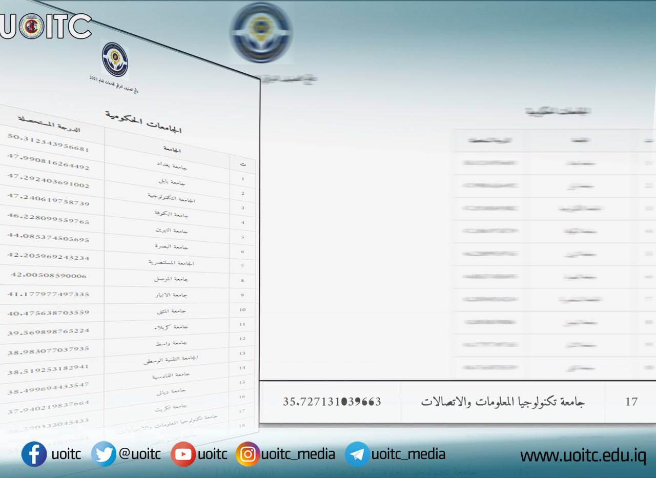 احرزت جامعة تكنولوجيا المعلومات والاتصالات المركز ال17 متقدمة على جميع الجامعات الفتية في العراق ومن اصل 37 مؤسسة حكومية خضعت للتقييم ضمن التصنيف العراقي للجامعات 2023