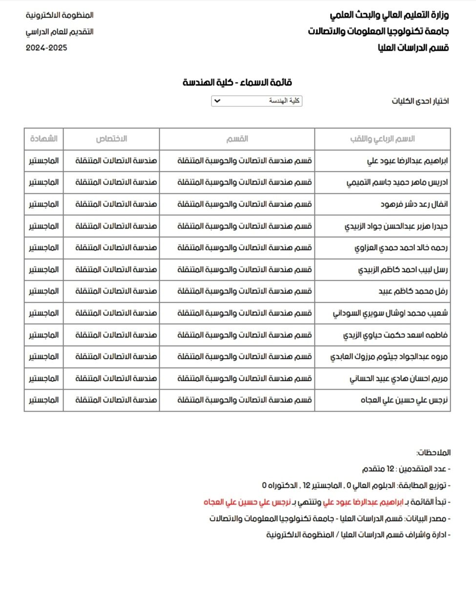 بتوجيه من رئيس الجامعة واشراف معاون الشؤون العلمية انجزت كلية الهندسة وقسم الدراسات العليا جميع مهام التحقق للمتقدمين في الجامعة للعام الدراسي 2024-2025. وفقا للجدول الزمني المعلن للوزارة الذي تديره إدارة البحث والتطوير.