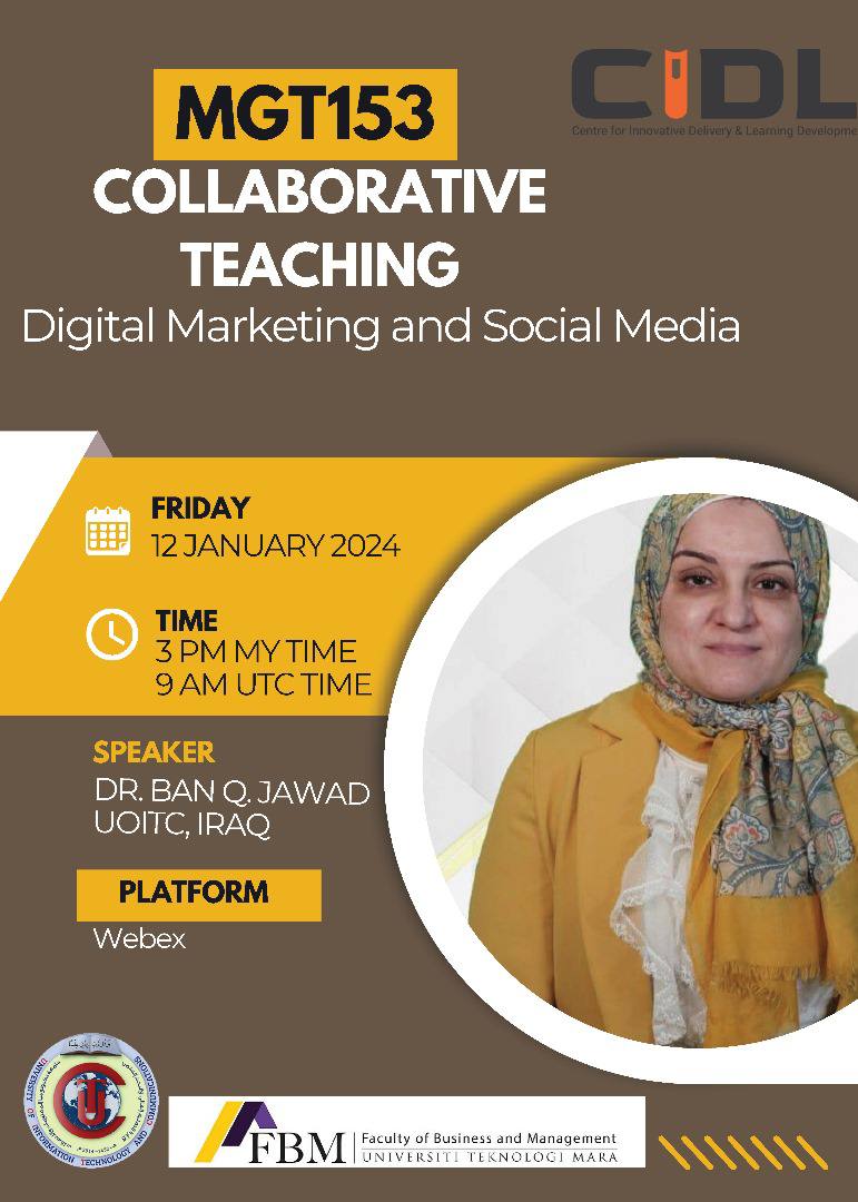 وتناولت الورشة التي عقدتها جامعة UiTM الماليزية محاضرة للدكتورة بان قاسم حول موضوع التجارة والتسويق الإلكتروني في وسائل التواصل الاجتماعي . كما ركزت في محاضرتها التي ألقتها عبر الإنترنت على اهم الفوائد والمخاطر المحتملة وكيف اصبحت وسائل التواصل الاجتماعي وسيلة مهمة بعد جائحة كورونا.
