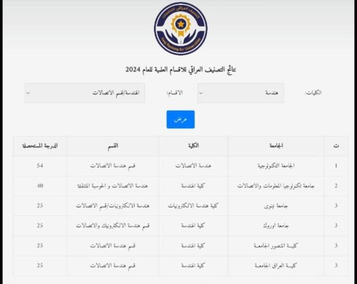 أعلنت وزارة التعليم العالي والبحث العلمي نتائج التصنيف العراقي للجامعات الحكومية والاهلية للعام ٢٠٢٤ ، وحصلت جامعة تكنولوجيا المعلومات والاتصالات على المرتبة 23 من اصل 37 جامعة حكومية وهي الأولى على نظيراتها الفتية.