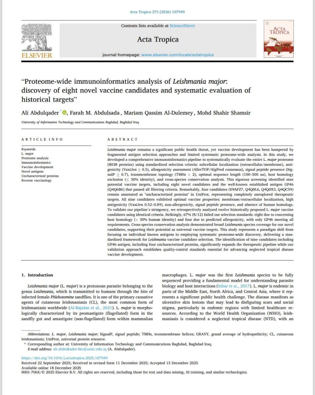 حيث تناول البحث توظيف تقنيات المعلوماتية الحيوية لترشيح لقاحات محتملة ضد طفيلي Leishmania major،