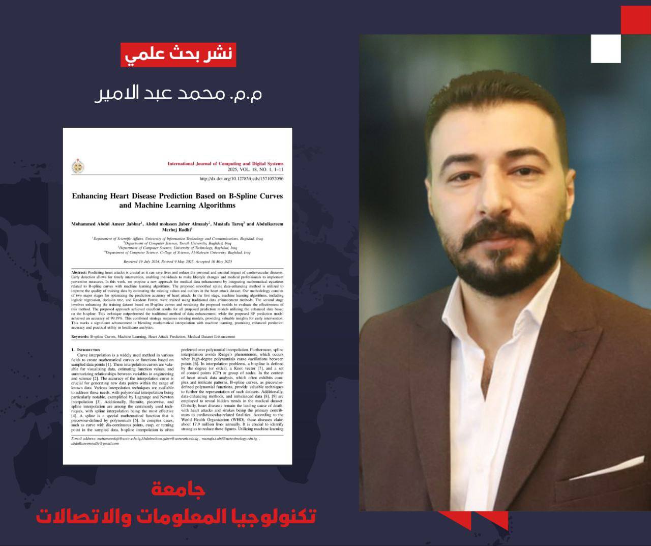 تمكّن فريق بحثي مشترك يضم التدريسي في قسم الشؤون العلمية برئاسة جامعة تكنولوجيا المعلومات والاتصالات م.م. محمد عبد الأمير جبار من نشر بحثٍ علمي متميز ضمن مستوعبات سكوباس (Scopus – Q3) في مجلة International Journal of Computing and Digital Systems الصادرة عن جامعة البحرين، بعنوان: