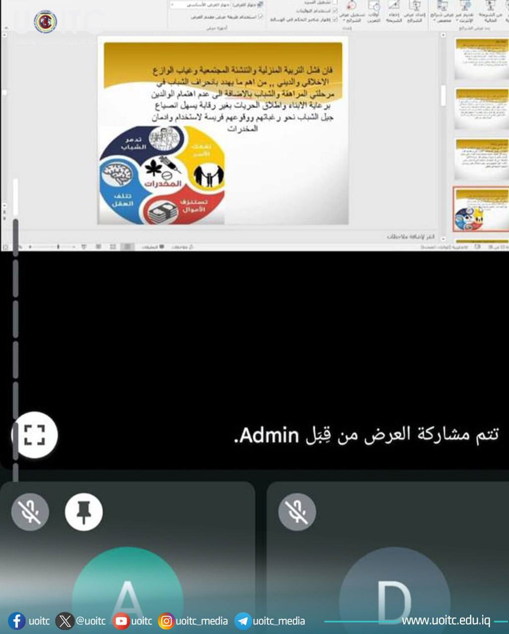 عقدت شعبة الإرشاد النفسي الجامعي وبالتعاون مع مركز التعليم المستمر في جامعة تكنولوجيا المعلومات والاتصالات، ندوة إلكترونية توعوية بعنوان “المخدرات وانعكاساتها النفسية والاجتماعية في تفاقم ظاهرة الانتحار”.