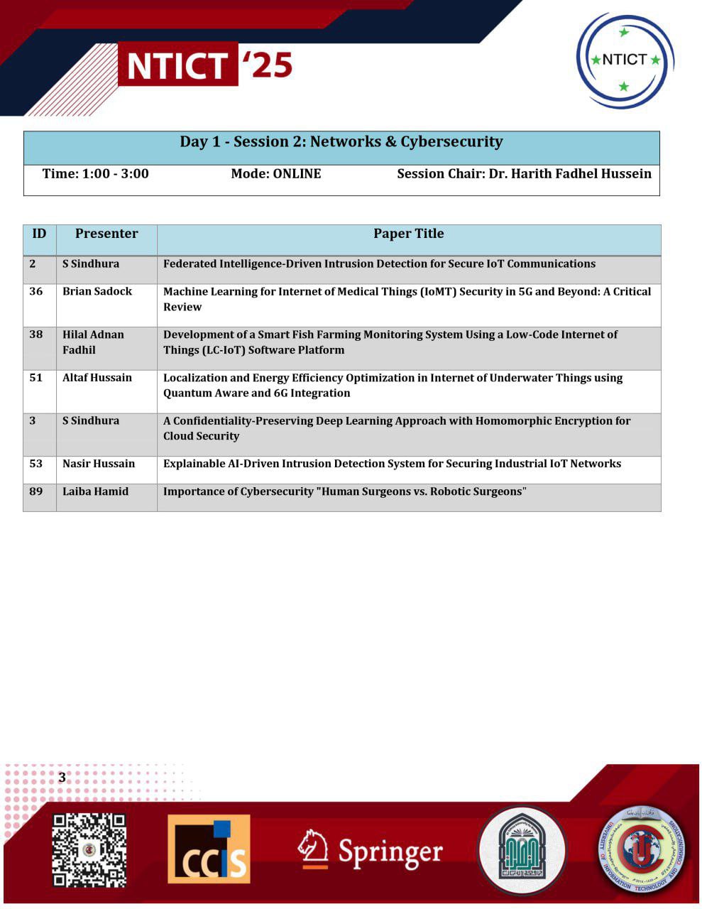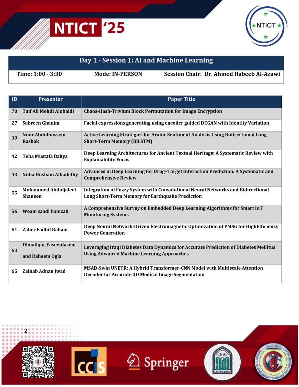 (التوجهات الحديثة في تطبيقات تكنولوجيا المعلومات والاتصالات NTICT’25)الدولي التاسع والذي تقيمه جامعة تكنولوجيا المعلومات والاتصالات بالتعاون مع جامعة الزهراء (ع) للبنات.