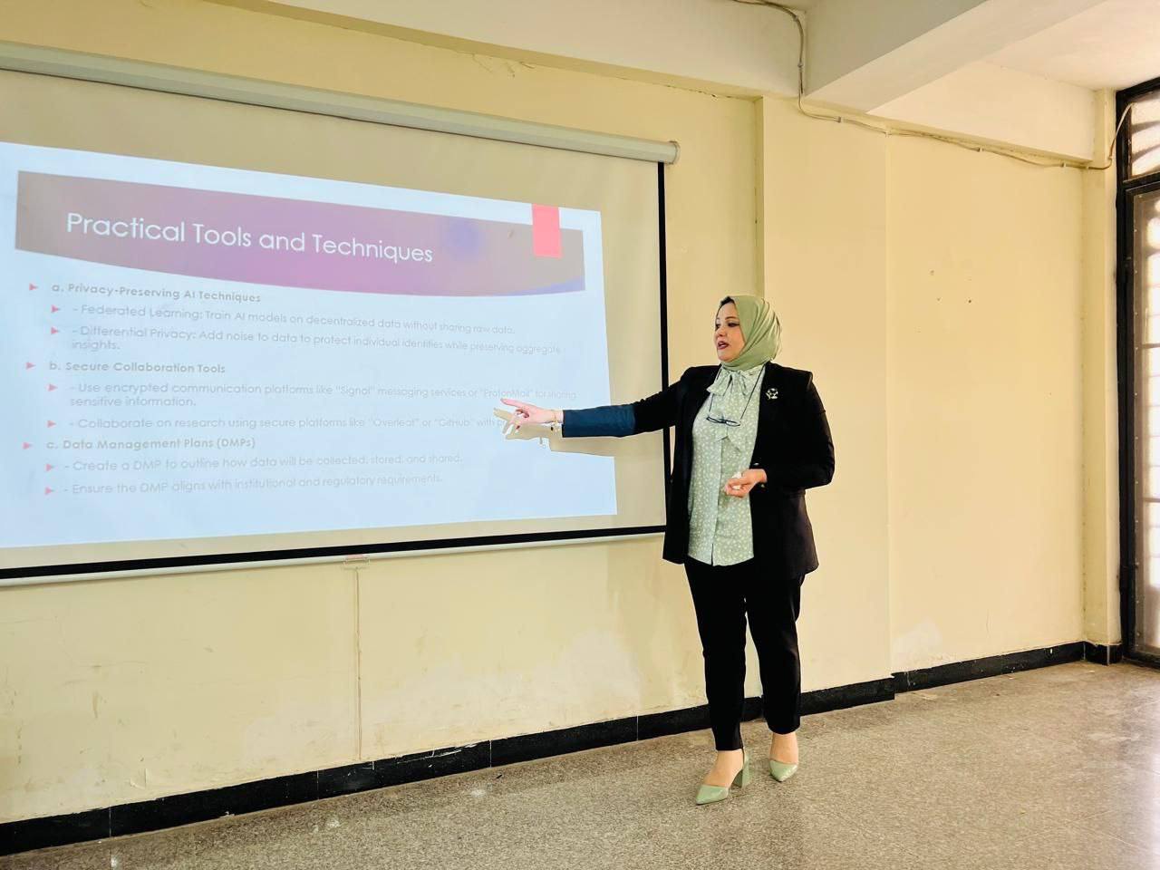 و تطرقت الندوة, التي ألقتها التدريسية م.د.ميس عبد الهادي محمد, إلى تعريف الذكاء الاصطناعي وخصوصية البيانات، والسبل المتبعة لحماية خصوصية البيانات، وكيفية الحفاظ على الحداثة وحقوق الملكية الفكرية.