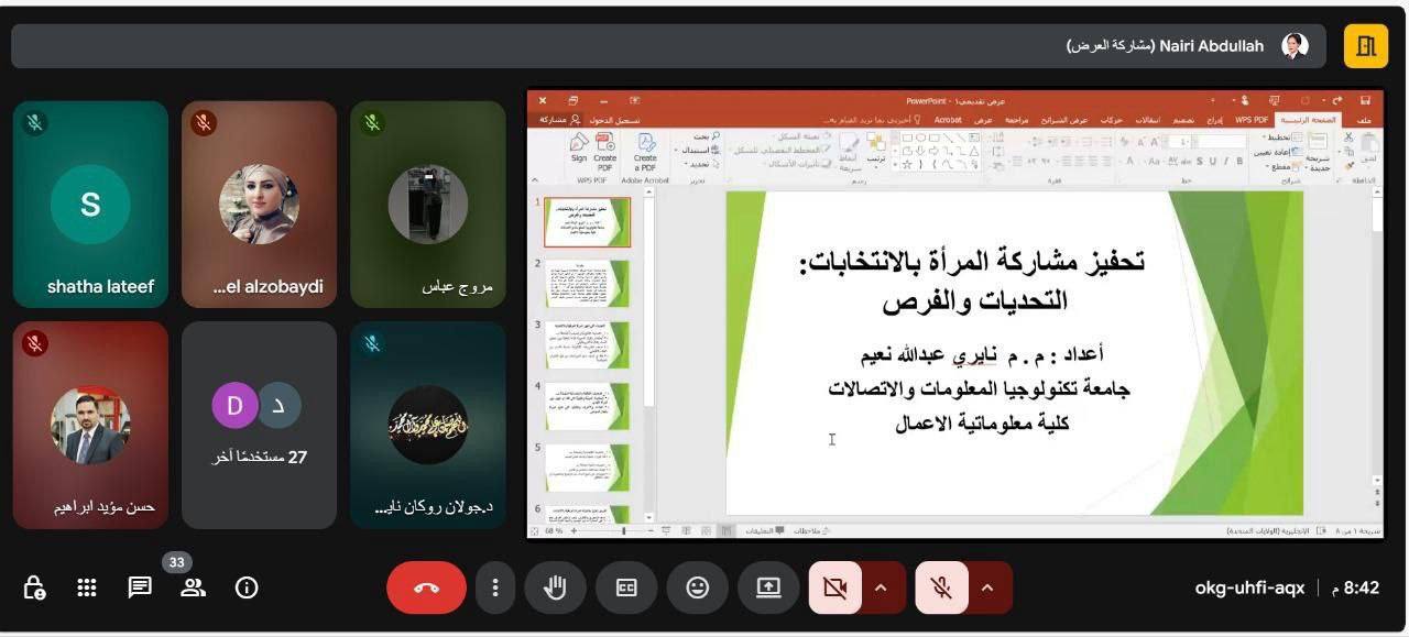 وهدفت الندوة التي قدمتها كل من م.م. مروج عباس مطلك من قسم الشؤون القانونية، وم.م. نايري عبدالله نعيم من كلية معلوماتية الأعمال، إلى تعزيز دور المرأة في العمل السياسي والانتخابي، والتأكيد على أهمية مشاركتها كعنصر فاعل في العملية الديمقراطية.