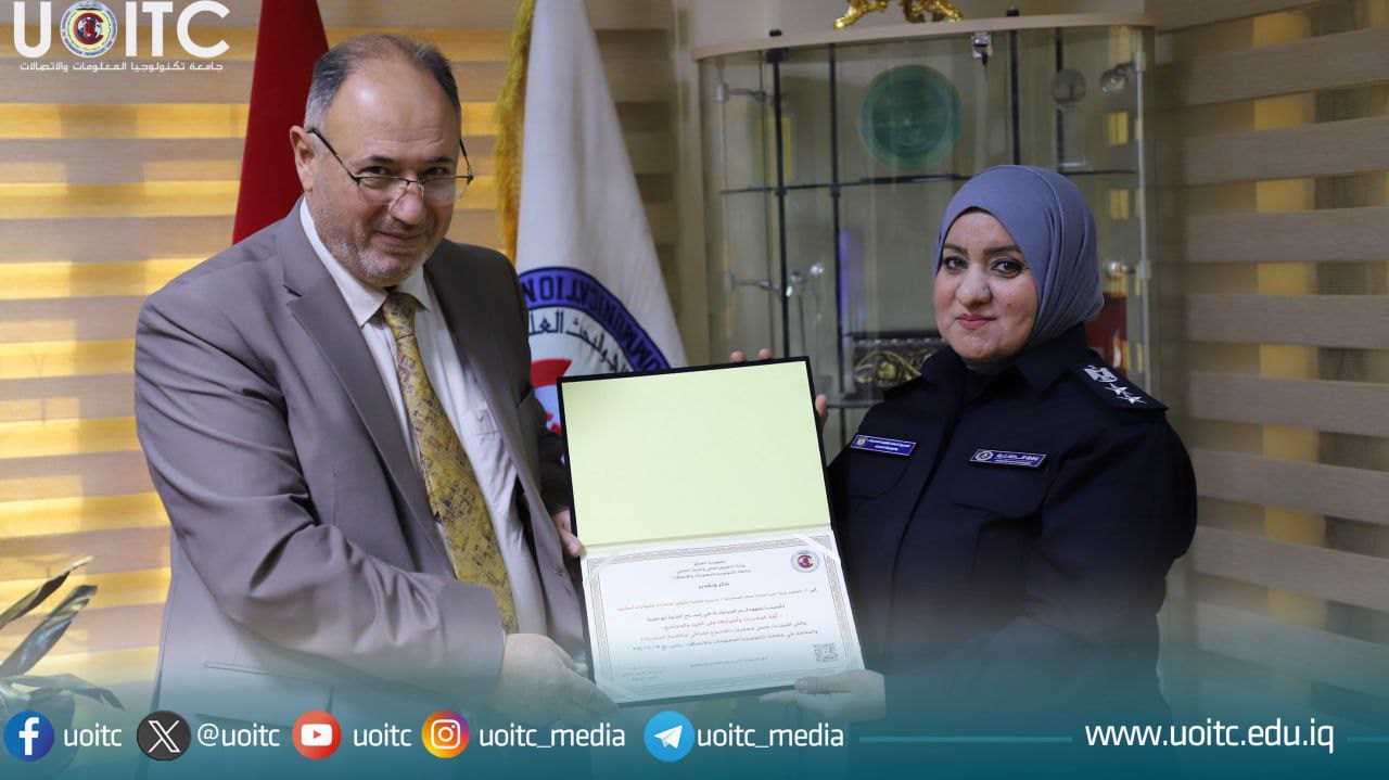 وفي ختام الندوة منح رئيس الجامعة الاستاذ الدكتور عباس محسن البكري شهادة تقديرية للعقيد زينة عبد السادة تقديرا لمشاركتها وجهودها في دعم برامج التوعية داخل الوسط الجامعي.