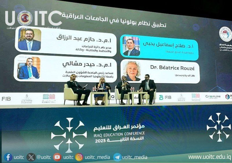 ضمن فعاليات اليوم الثالث من مؤتمر العراق للتعليم العالي – النسخة الثانية – التي يُعقد في جامعة بغداد في الجادرية بقاعة الحكيم، شارك الأستاذ المساعد الدكتور حيدر مشالي، مساعد رئيس جامعة تكنولوجيا المعلومات والاتصالات للشؤون العلمية، في جلسة حوارية بعنوان «تطبيق نظام بولونيا في الجامعات العراقية».