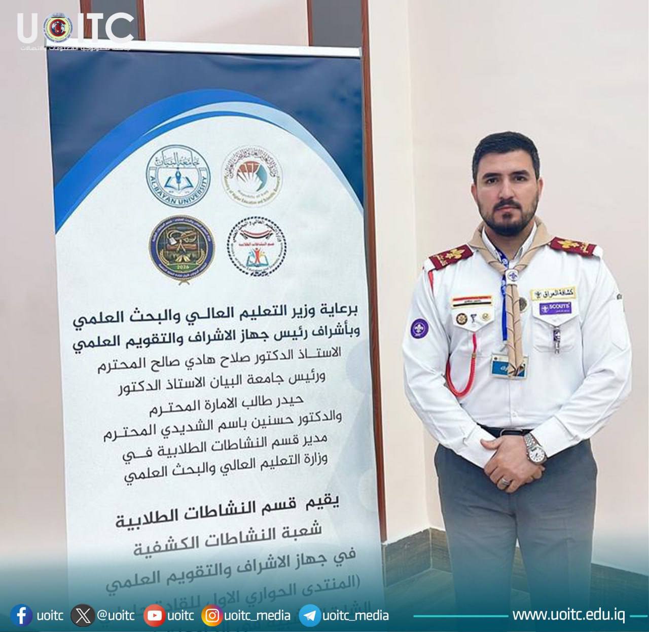 ومثّل وفد الجامعة التدريسي في قسم النشاطات الطلابية م.م. نوفل ماجد محي، مسؤول شعبة النشاطات الكشفية، حيث شهد المنتدى مناقشات مستفيضة تناولت واقع العمل الكشفي في الجامعات العراقية، وأبرز التحديات والمعوقات التي تواجهه، مع طرح الحلول الكفيلة بتطوير هذا القطاع الحيوي وتعزيز دوره في تنمية مهارات الطلبة القيادية والتطوعية.