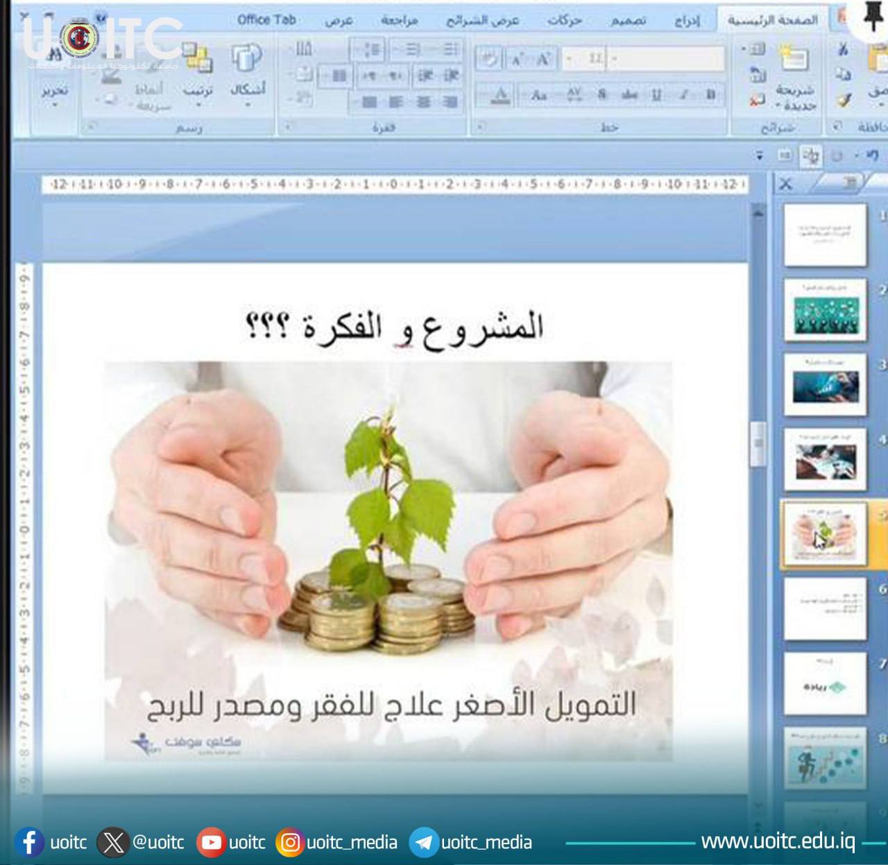وقدمت الندوة مسؤول شعبة التأهيل والتوظيف في الجامعة ومدربة مبادرة ريادة الدكتورة آلاء طلال ياسين، حيث استعرضت خلالها أبرز الآليات المعتمدة لتمويل المشاريع ضمن مبادرة ريادة، فضلاً عن التعريف بمفهوم المشاريع الصغيرة والمتوسطة وأهميتها في دعم الاقتصاد وتعزيز فرص العمل.