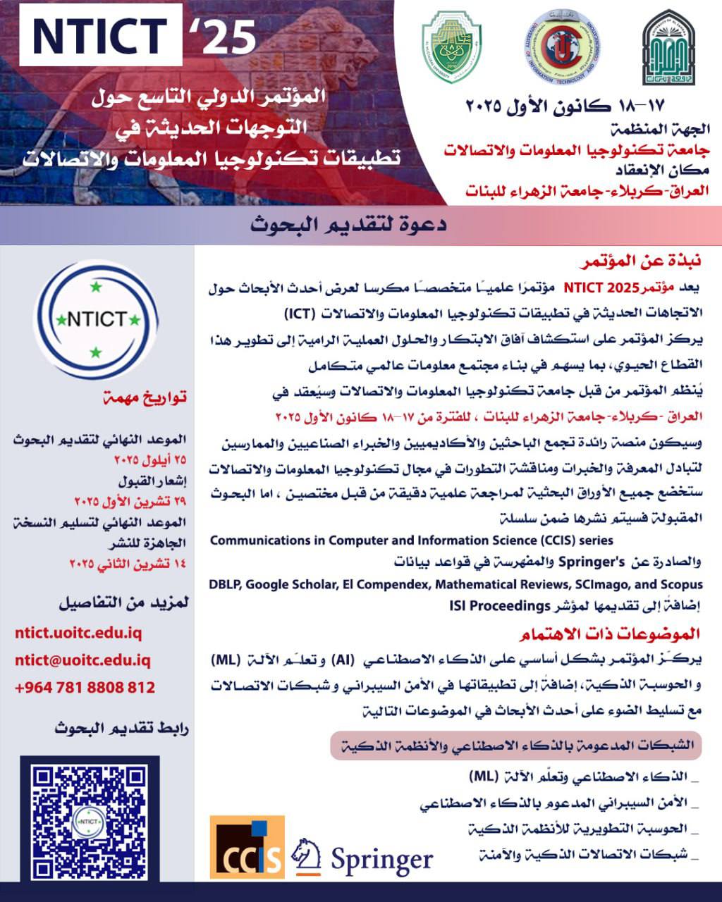 تعلن جامعة تكنولوجيا المعلومات والاتصالات عن تمديد موعد استقبال البحوث [...]