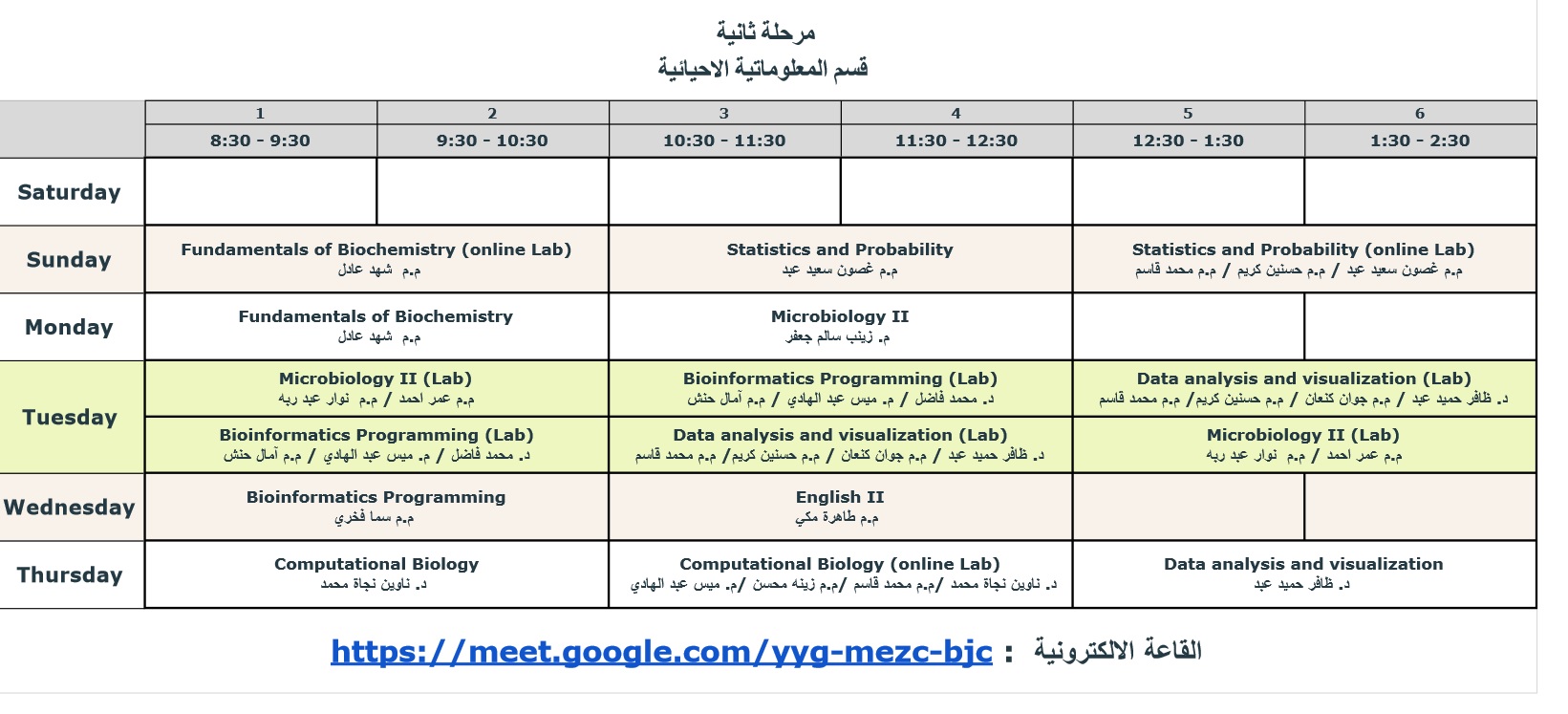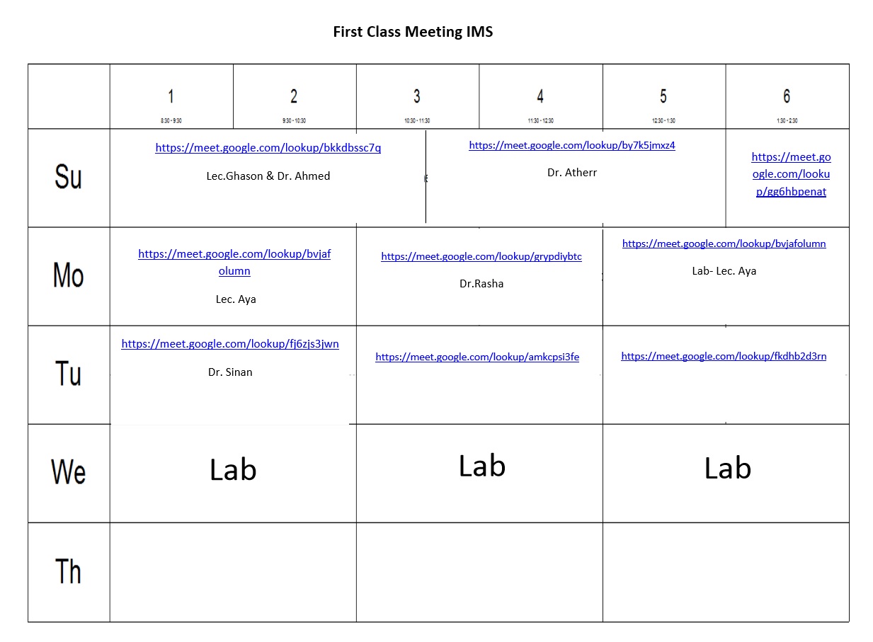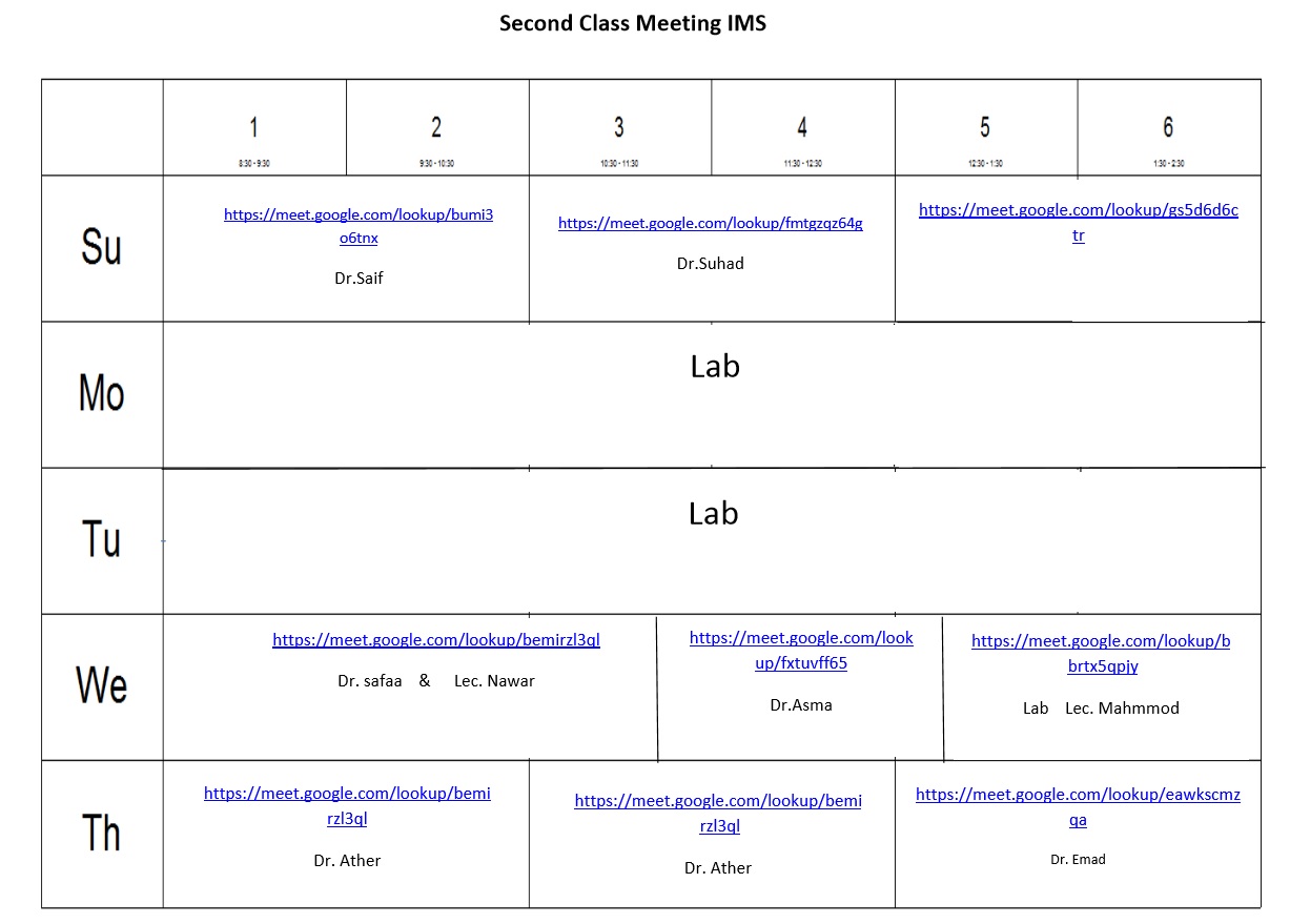 ادناه جدول المحاضرات لقسمي كلية المعلوماتية الطبية الحيوية للمرحلتين الاولى والثانية للفصل الدراسي الثاني للعام الدراسي 2020 - 2021