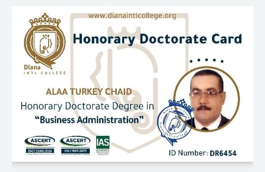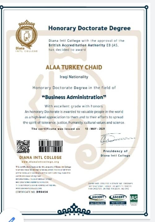 تبارك عمادة كلية المعلوماتية الطبية الحيوية للاستاذ ( علاء تركي جياد) المحترم حصوله على الدكتوراه الفخرية باختصاص ادارة الاعمال من جامعة ديانا انتل من بريطانيا.